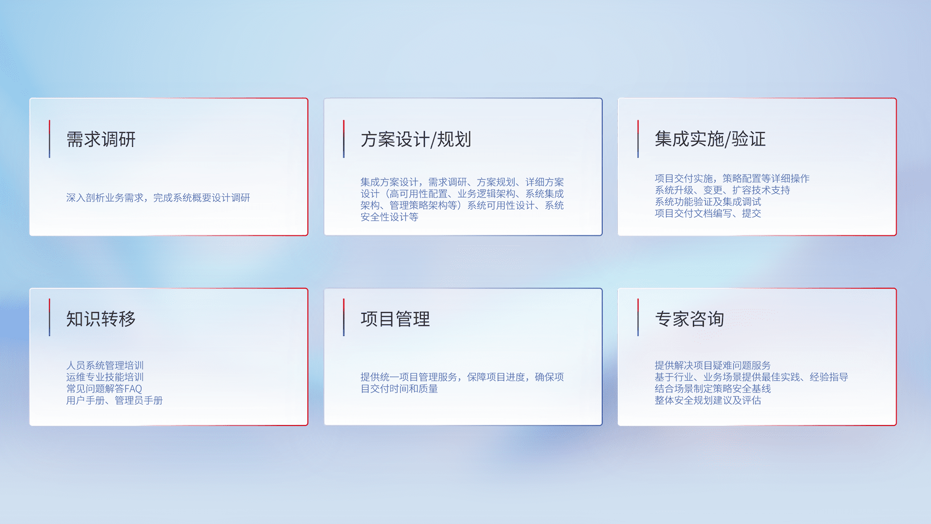 针对客户行业特性,,将宏观的安全战略和需求,,,,通过专业的交付服务,,,实现项目落地,,为客户提供标准规范的集成交付服务。。。